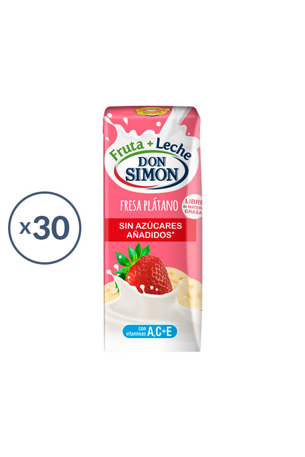 Fruta + leche Don Simón sabor fresa y plátano. Elaborado con fresa, plátano y leche desnatada. Sin azúcares añadidos y rico en vitaminas A,C y E.