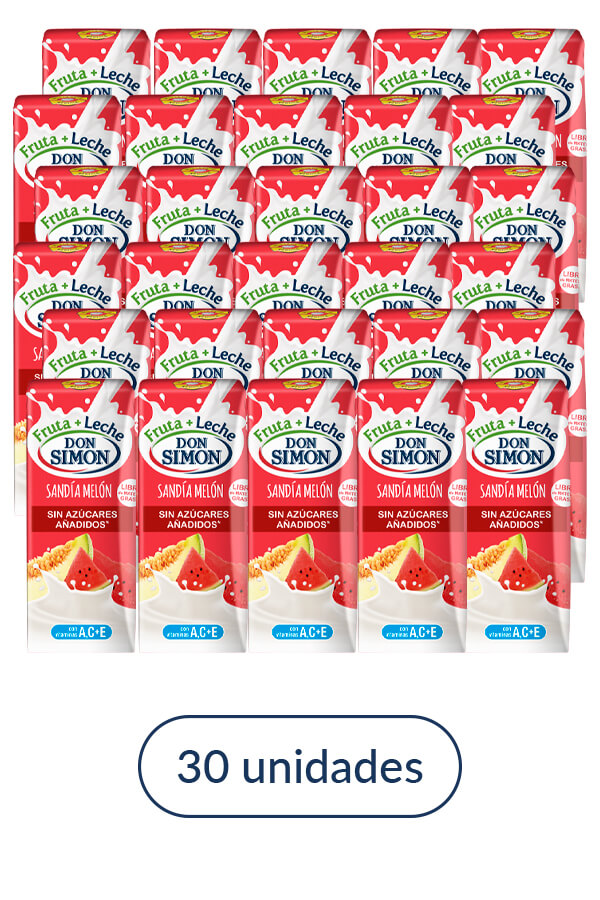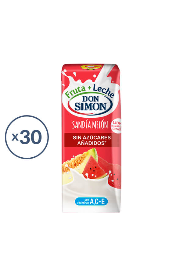 Fruta + leche Don Simón sabor sandía y melón. Elaborado con melón, sandía y leche desnatada. Sin azúcares añadidos y rico en vitaminas A,C y E.