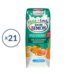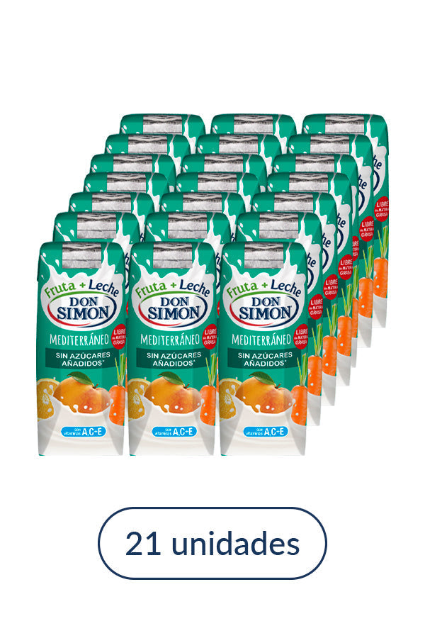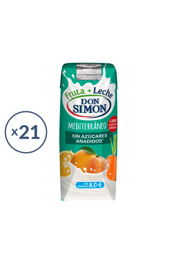 Fruta + leche Don Simón sabor Mediterráneo. Elaborado con naranja, uva, melocotón, zanahoria y leche desnatada. Sin azúcares añadidos y rico en vitaminas A,C y E.