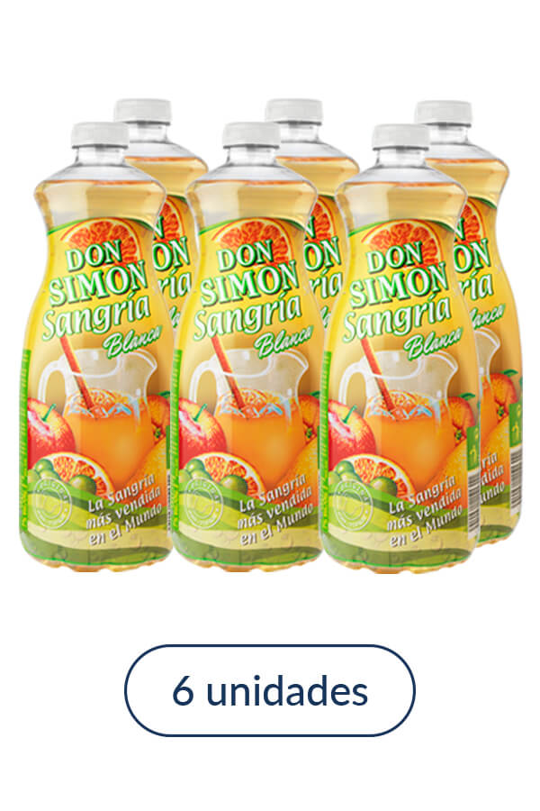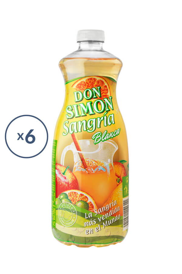 Sangría Don Simón, BLANCA. Elaborada con vino blanco, azúcar, extractos naturales de frutas y canela.