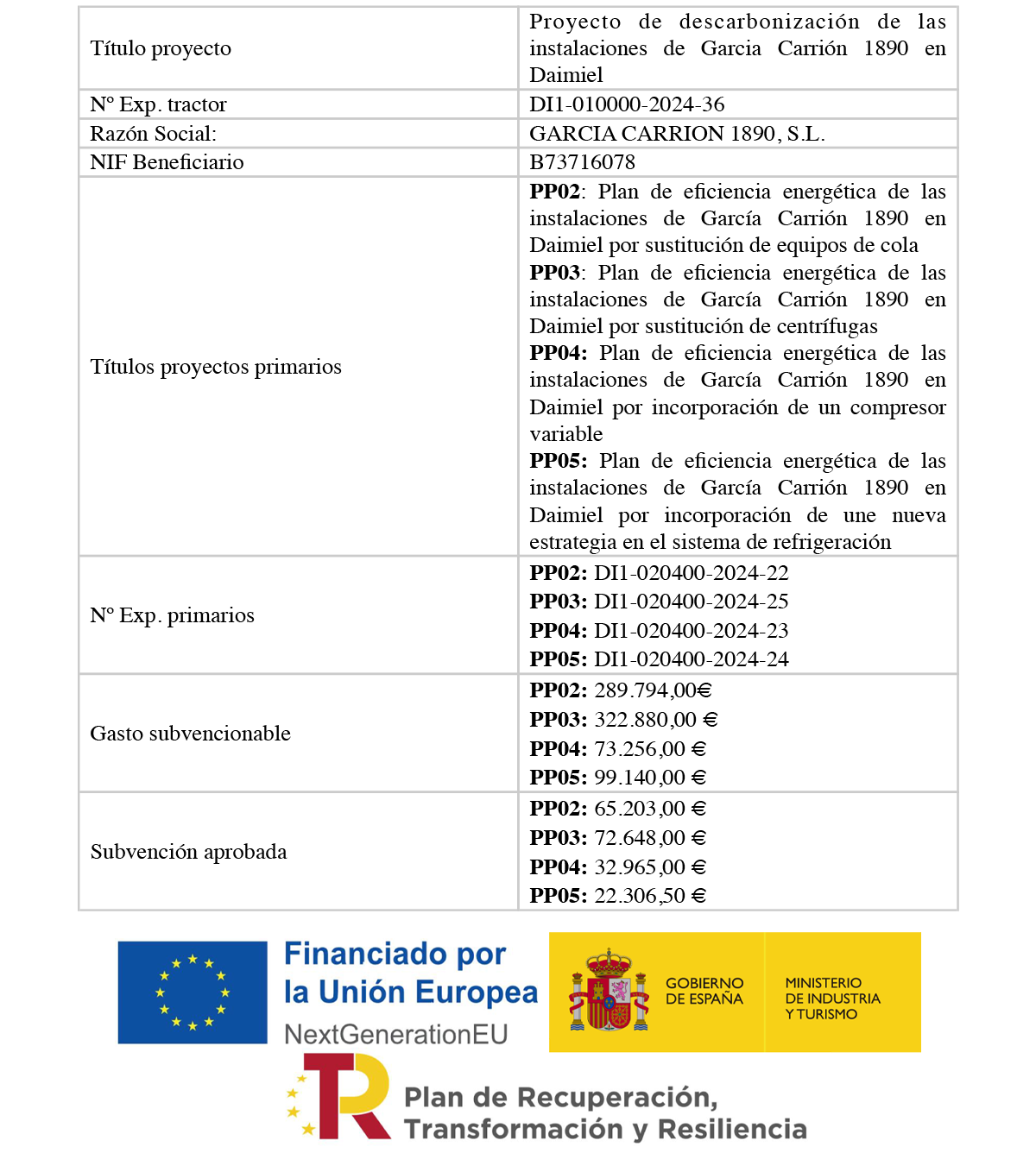 - Empresa beneficiaria: J. GARCIA CARRION JUMILLA SLU
