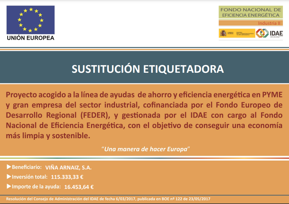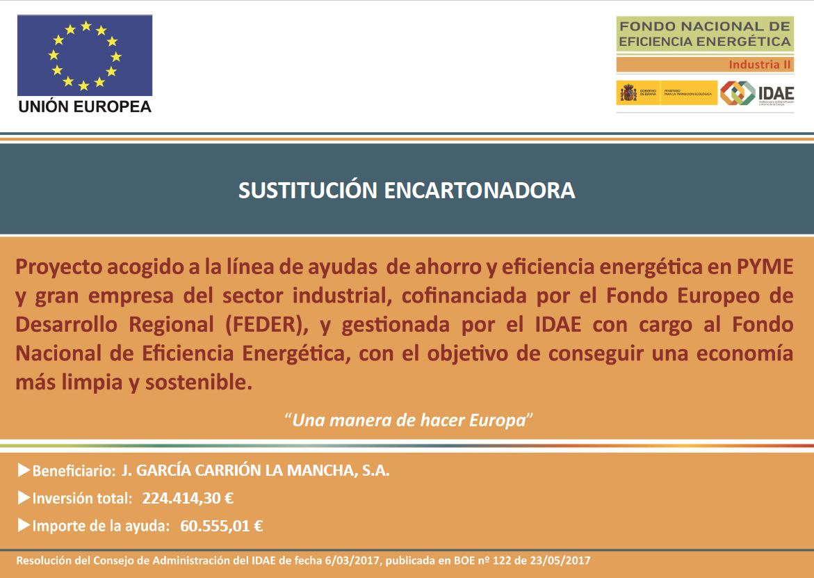 GARCÍA CARRIÓN JUMILLA, S.L., ha recibido una ayuda para su proyecto de ahorro y eficiencia energética SUSTITUCIÓN LÍNEA DE VIDRIO, a través del FONDO NACIONAL DE EFICIENCIA ENERGÉTICA y gestionado por el INSTITUTO DE DIVERSIFICACIÓN Y AHORRO DE LA ENERGÍA (IDAE), ayuda cofinanciada por la Unión Europea a través del Programa Operativo FEDER de Crecimiento Sostenible 2014-2020. Se ha elaborado un proyecto de ahorro y eficiencia energética consistente en la Sustitución de una línea de envasado de vidrio convencional, por otra que incorpora las técnicas más avanzadas en productividad y eficiencia energética. Se ha requerido la colaboración de los mejores fabricantes de equipamiento del sector, que nos aportarán grandes ahorros energéticos y medioambientales en el proceso, consiguiendo un ahorro estimado de 105,40 tep/año.