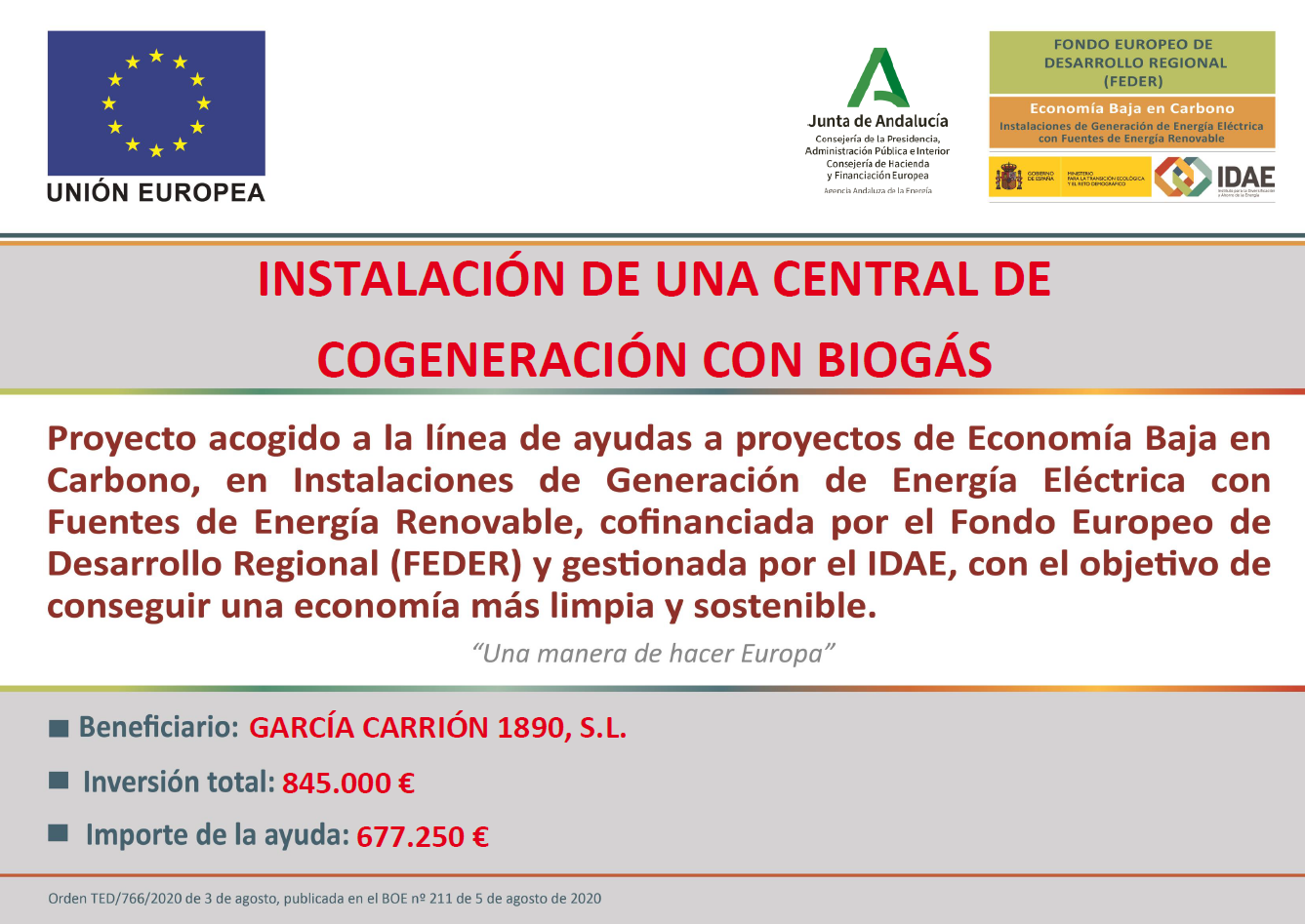GARCÍA CARRIÓN 1890, S.L. ha recibido una ayuda para su proyecto de ahorro y eficiencia energética “INSTALACIÓN DE UNA CENTRAL DE COGENERACIÓN CON BIOGÁS”, cofinanciada por el Fondo Europeo de Desarrollo Regional (FEDER), coordinada por IDAE y gestionada por las autonomías, con cargo al Fondo Nacional de Eficiencia Energética, con el objetivo de conseguir una economía más limpia y sostenible. Se ha elaborado un proyecto de generación de energía eléctrica renovable a partir de la obtención de biogás de la EDAR. Se ha instalado un sistema de cogeneración mediante turbina para la generación de energía eléctrica. Se ha requerido la colaboración de los mejores fabricantes de equipamiento del sector. Los indicadores del resultado del proyecto han sido: indicador C030 = 1,2 MW e indicador C034 = 1.656 tCO2/año.