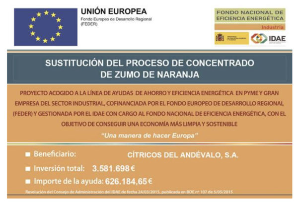 CÍTRICOS DEL ANDÉVALO, S.A. ha recibido una financiación del Ministerio de Industria, Energía y Turismo, dentro del Programa de Reindustrialización y Fomento de la Competitividad Industrial para el proyecto “Aprovechamiento térmico de las aguas residuales para la mejora de la competitividad”.