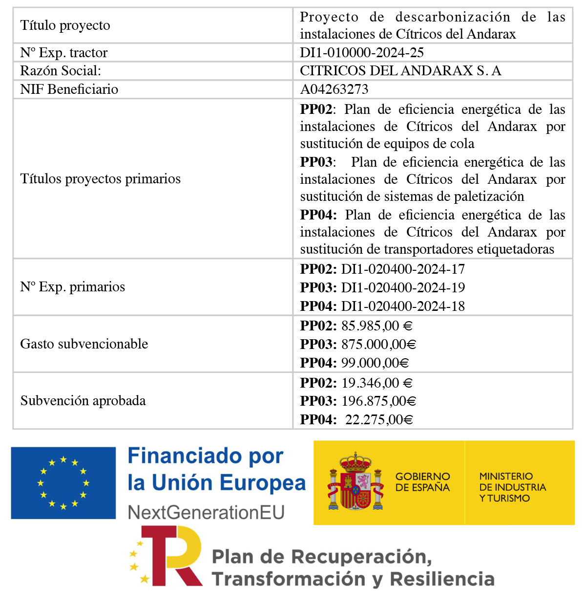 - Empresa beneficiaria: CITRICOS DEL ANDARAX, S.A.