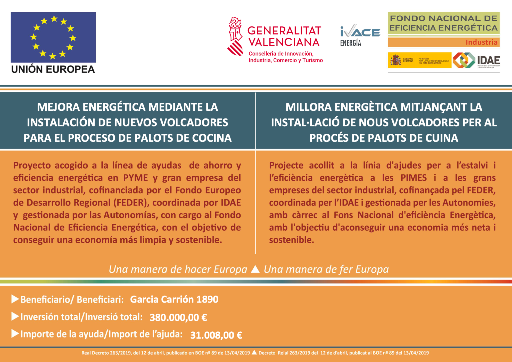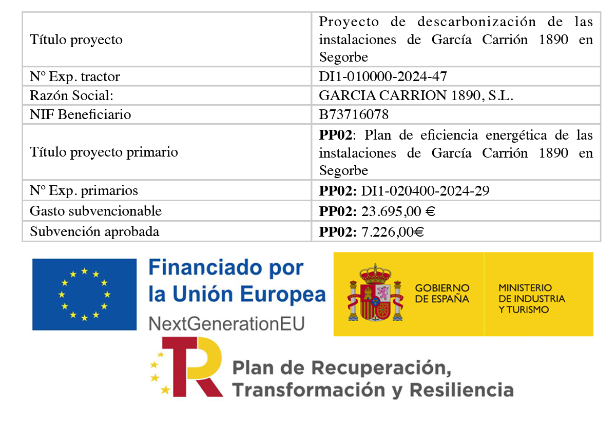 GARCÍA CARRIÓN 1890, S.L. HA REALIZADO UN PROYECTO DE AHORRO Y EFICIENCIA ENERGÉTICA CON EL APOYO ECONÓMICO DEL INSTITUTO PARA LA DIVERSIFICACIÓN Y AHORRO DE LA ENERGÍA, Y COFINANCIADO POR LA UNIÓN EUROPEA.