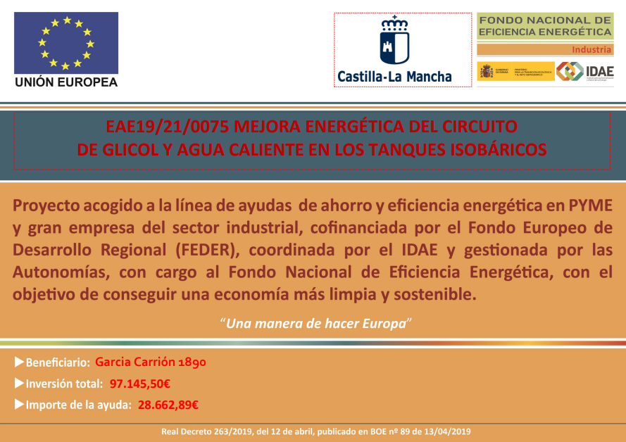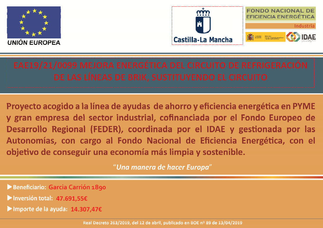GARCÍA CARRIÓN 1890 ha recibido una ayuda para su proyecto de ahorro y eficiencia energética “MEJORA ENERGÉTICA DEL CIRCUITO DE REFRIGERACIÓN DE LAS LÍNEAS DE BRIK, SUSTITUYENDO EL CIRCUITO” proyecto acogido a las ayudas de I.D.A.E. y la Consejería de Desarrollo Sostenible cofinanciado por la Unión Europea dentro del Programa Operativo FEDER 2014-2020 con Fondo Europeo de Desarrollo Regional (FEDER) coordinada por I.D.A.E. y gestionada por las autonomías, con cargo al Fondo Nacional de Eficiencia Energética, con el objetivo de conseguir una economía más limpia y sostenible.