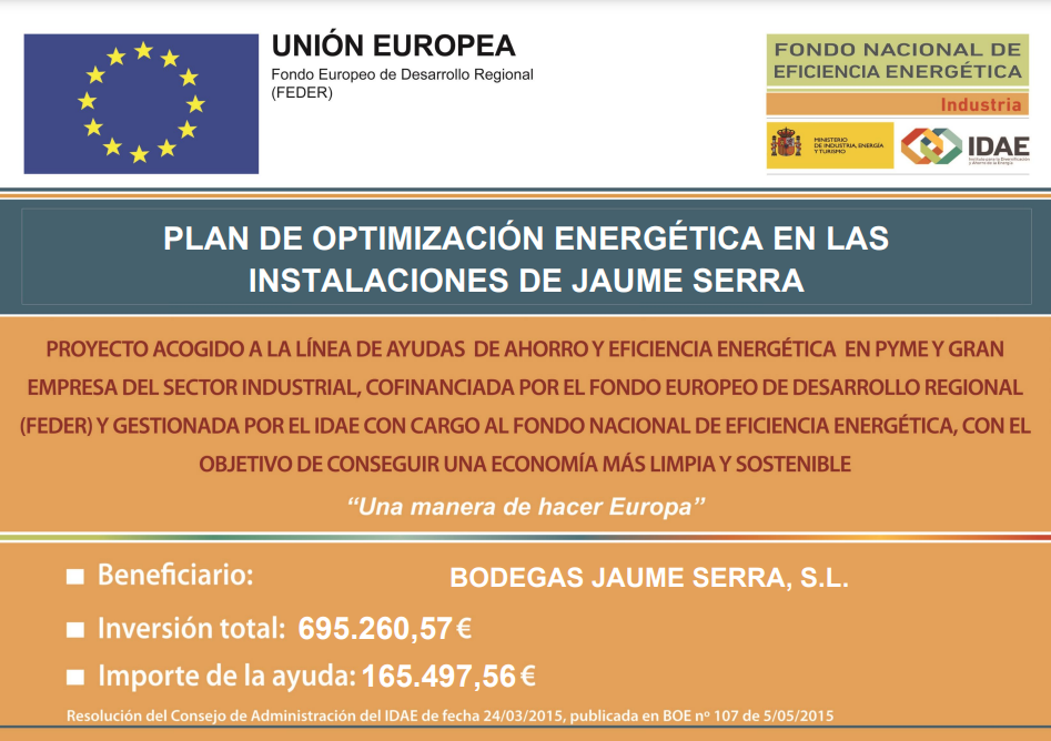 BODEGAS JAUME SERRA, SL. ha recibido una ayuda para su proyecto de ahorro y eficiencia energética PLAN DE OPTIMIZACIÓN ENERGÉTICA EN LAS INSTALACIONES DE JAUME SERRA a través del FONDO NACIONAL DE EFICIENCIA ENERGÉTICA y gestionado por INSTITUTO DE DIVERSIFICACIÓN Y AHORRO DE LA ENERGÍA (IDAE), ayuda cofinanciada por la Unión Europea a través del Programa Operativo FEDER de Crecimiento Inteligente 2014-2020. El proyecto ha consistido en implantar las siguientes actuaciones: