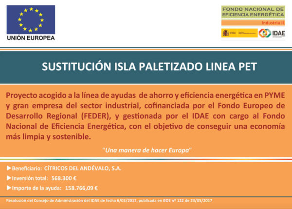 CÍTRICOS DEL ANDÉVALO, S.A.,ha recibido una ayuda para su proyecto de ahorro y eficiencia energética SUSTITUCIÓN ISLA PALETIZADO LINEA PET, a través del FONDO NACIONAL DE EFICIENCIA ENERGÉTICA y gestionado por el INSTITUTO DE DIVERSIFICACIÓN Y AHORRO DE LA ENERGÍA (IDAE), ayuda cofinanciada por la Unión Europea a través del Programa Operativo FEDER de Crecimiento Inteligente 2014-2020. El proyecto ha consistido en sustituir la isla de paletizado inicial de la línea PET, por una nueva isla completamente integrada con la línea de envasado y con el sistema de transporte/expedición LGV’s, eliminando con ello, paradas de proceso improductivas y mejorando así el rendimiento total de la línea. Consiguiendo un ahorro estimado de 202,46 tep/año.