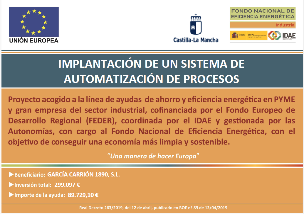 GARCÍA CARRIÓN 1890, S.L. ha recibido una ayuda para su proyecto de ahorro y eficiencia energética IMPLANTACIÓN DE UN SISTEMA DE AUTOMATIZACIÓN DE PROCESOS, cofinanciada por el Fondo Europeo de Desarrollo Regional (FEDER), coordinada por IDAE y gestionada por las autonomías, con cargo al Fondo Nacional de Eficiencia Energética, con el objetivo de conseguir una economía más limpia y sostenible. Se ha mejorado el sistema automático de control de procesos para que garantice en todo momento que las instalaciones trabajan a un rendimiento óptimo y evitar funcionamientos ineficientes y/o innecesarios. Se ha requerido la colaboración de los mejores fabricantes de equipamiento del sector, que nos aportarán grandes ahorros energéticos y medioambientales en el proceso. Gracias al proyecto se ahorran 136,63 teps anuales.
