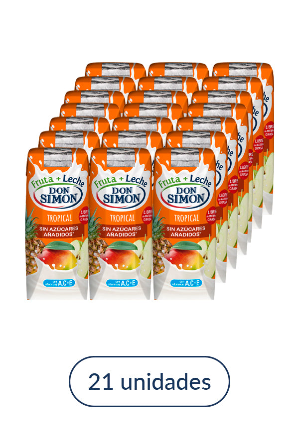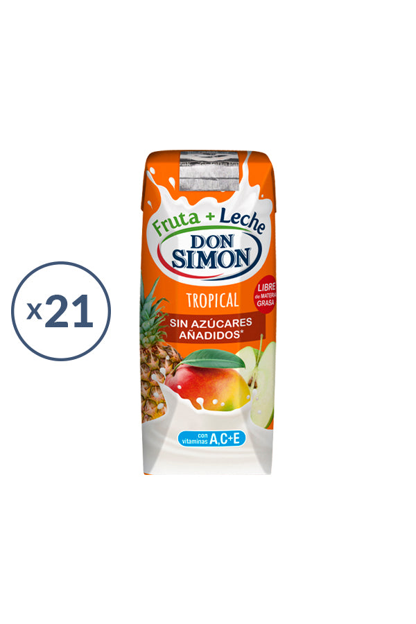 Fruta+leche Tropical Don Simón. Elaborado con piña, uva, mango, manzana y leche desnatada. Sin azúcares añadidos y rico en vitaminas A,C y E.